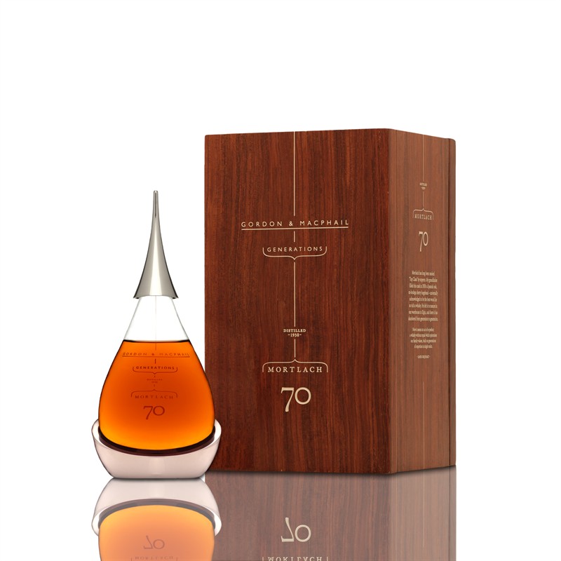 The sleek, modern teardrop-shaped crystal decanter that holds Scottish whisky merchant Gordon & MacPhail’s Mortlach 70-year-old belies its pedigree. Aged since October 15, 1938 in an ex-bodega sherry hogshead cask made from Spanish oak, it is the world’s oldest bottled single malt whisky. Presented in a handmade Brazilian Rosewood box, it is available in 54 standard-size 700ml decanters selling for approximately US$16,000 each, and 162 smaller sized 200ml decanters at approximately US$4,000 each.